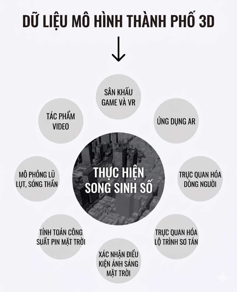 Thứ ba, mô hình 3D có thể trở thành “sân khấu” cho game, VR, AR và sản xuất nội dung. Lý do không chỉ vì nó chi tiết, mà còn vì hình dạng được mô tả chính xác và gắn với kinh vĩ độ, nên việc “đè khít” nội dung số lên thế giới thật—đặc biệt trong AR—trở nên thuận lợi hơn.