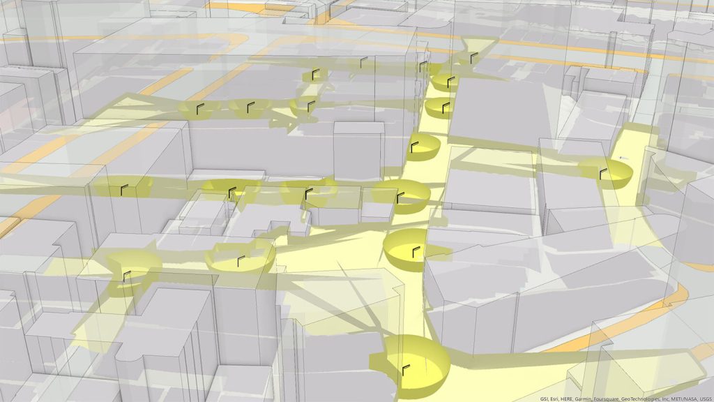 3D + thuộc tính mở ra mô phỏng rất thực tế: chiếu sáng, tầm nhìn, an toàn đô thị… (Mô phỏng mức độ chiếu sáng của đèn đường)