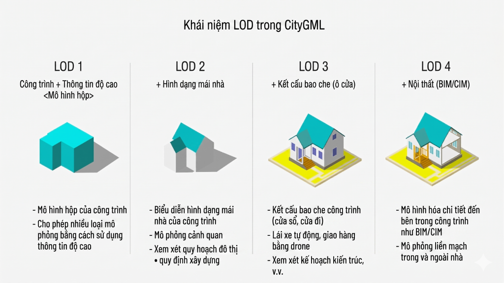 2) LOD (Level of Detail): cùng một thành phố, nhiều mức chi tiết – và nhiều mục tiêu sử dụng