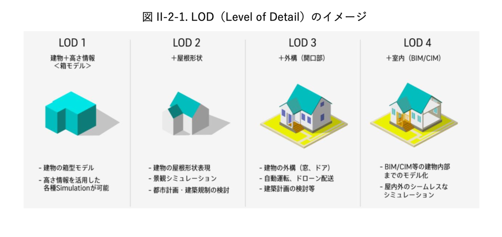 Khái niệm LOD cho phép chúng ta kiểm soát mức độ trừu tượng hoặc chi tiết của một đối tượng. Theo tiêu chuẩn quốc tế CityGML, không gian 3D được chia thành 5 cấp độ chính.